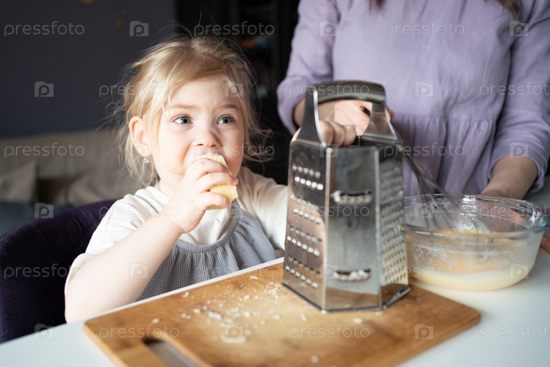 Очаровательная маленькая голубоглазая дочь ест сыр, пока готовит омлет с мамой на кухне, маленький ребенок чувствует голод, пробует еду, сидя за столом, и готовит еду с мамой дома