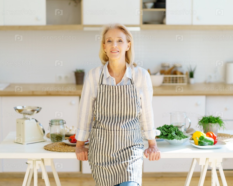 Портрет красивой пожилой женщины, стоящей на кухне и улыбающейся в камеру во время приготовления здоровой еды