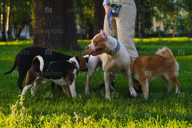 Анонимная женщина, гуляющая с американским питбулем в парке. Собака встречает других собак на закате