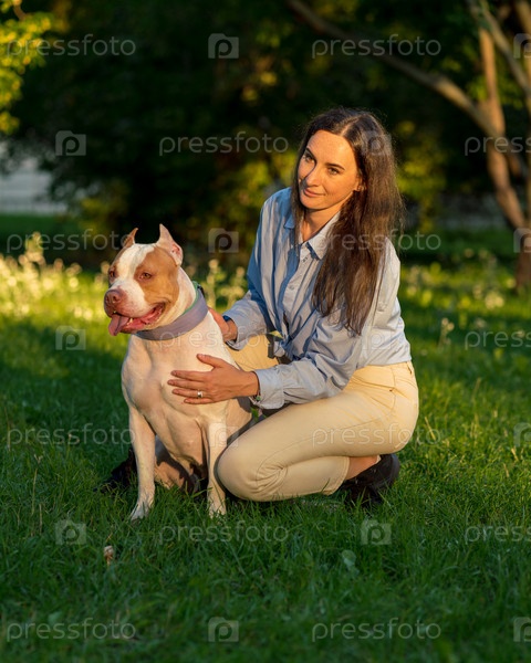Женщина сидит на корточках и гладит счастливого американского питбультерьера на рассвете