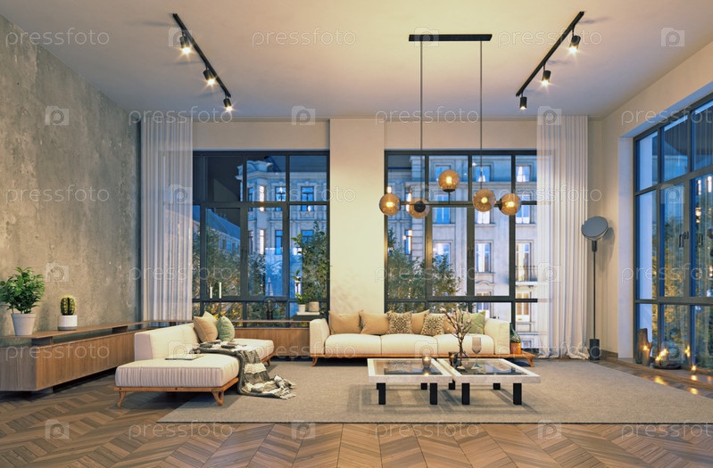 Современный дизайн интерьера гостиной Концепция 3D-рендеринга Гостиная