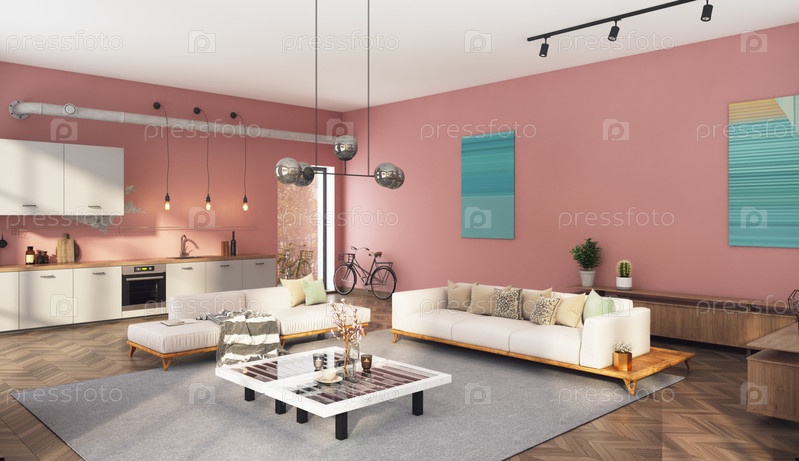 Современная гостиная с розовыми стенами, деревянным полом, белыми диванами и журнальным столом. 3D-рендеринг