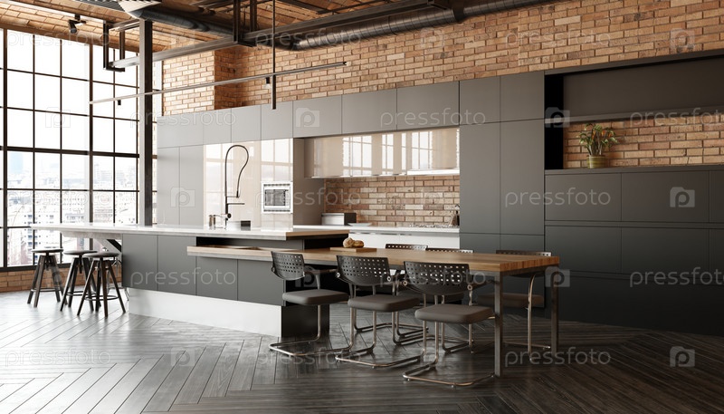 Интерьер современной кухни с кирпичными стенами, деревянным полом, серыми столами и стойкой в баре со стульями. 3D-рендеринг