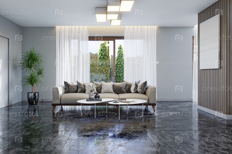 Интерьер современной гостиной с серыми стенами, бетонным полом, серым диваном и журнальным столом. 3D-рендеринг
