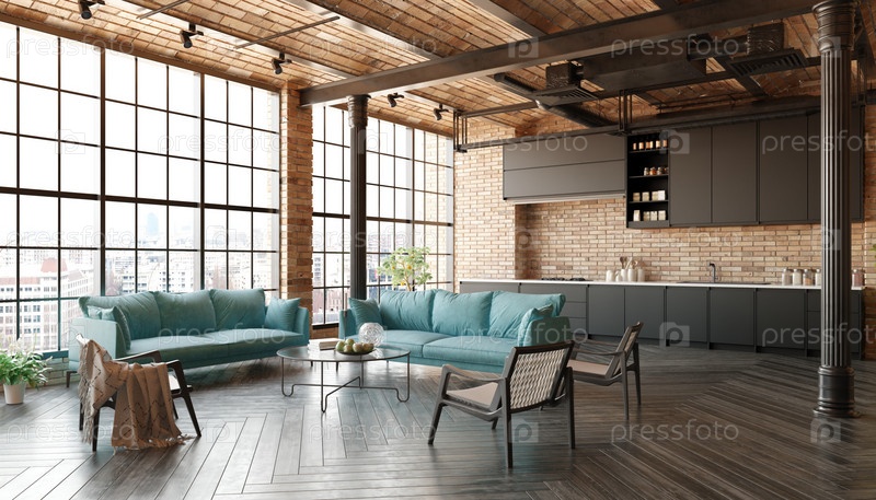 Современная гостиная в лофте с диваном и кухней