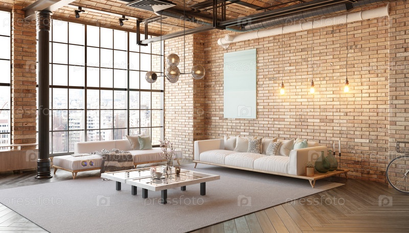 Современная гостиная в стиле лофт с диваном и журнальным столом. номер имеет минималистский и чистый дизайн с акцентом на функциональность и комфорт. 3D-рендеринг