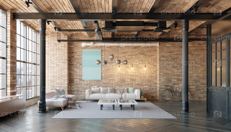 Современная гостиная в стиле лофт с диваном и журнальным столом. номер имеет минималистский и чистый дизайн с акцентом на функциональность и комфорт. 3D-рендеринг