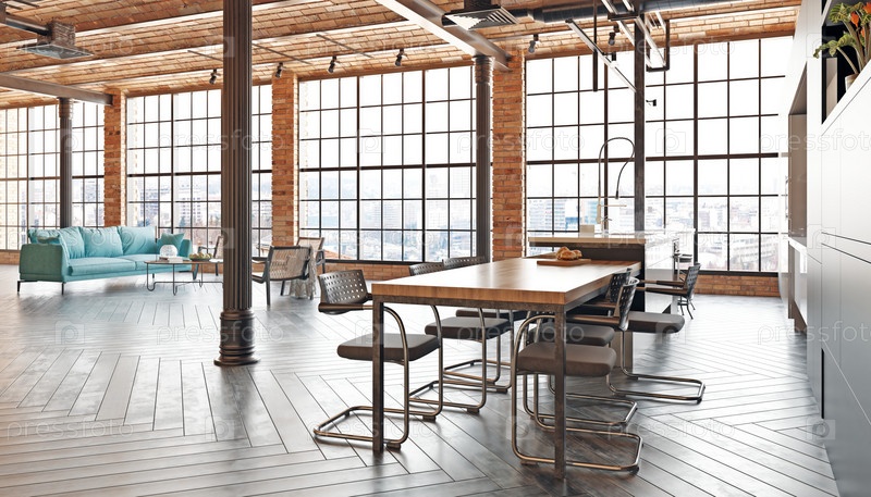 Большая открытая комната с деревянным столом и стульями. Комната выглядит современной и просторной. 3D-рендеринг