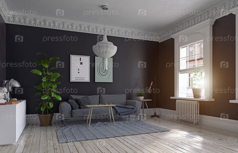 Современный дизайн интерьера гостиной в скандинавском стиле. Концепция 3d иллюстрации