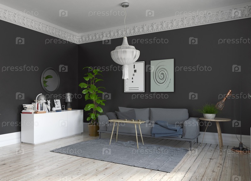 Современный дизайн интерьера гостиной в скандинавском стиле. Концепция 3d иллюстрации