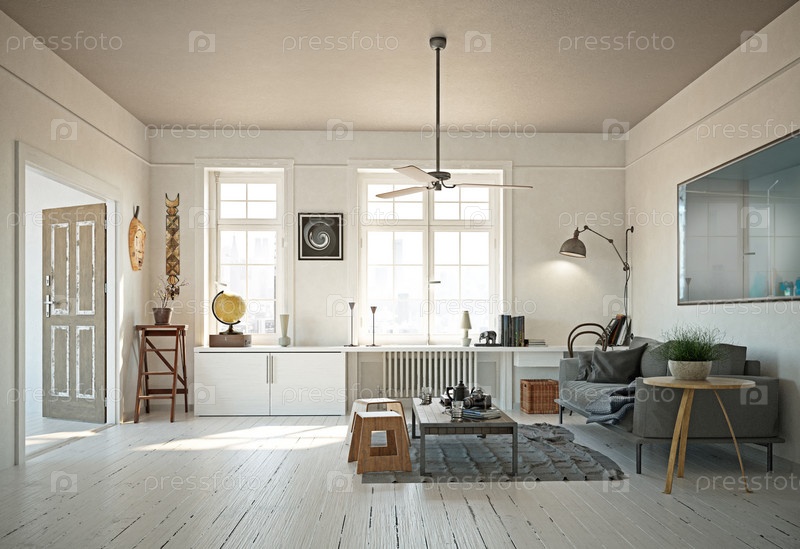 Современный дизайн интерьера гостиной в скандинавском стиле. Концепция 3d иллюстрации