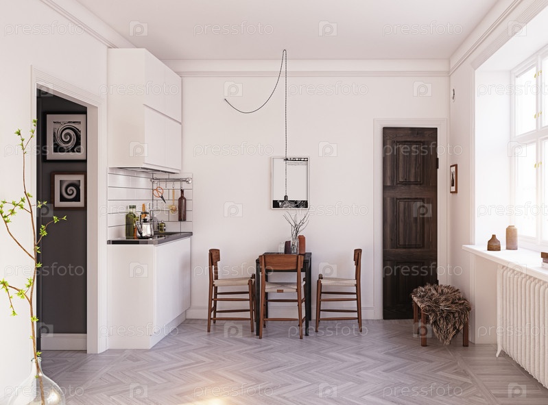 Компактный дизайн кухни в скандинавском стиле.Концепция 3D-рендеринга