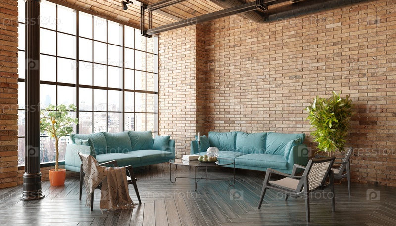 Современная гостиная в стиле лофт с диваном и журнальным столом. номер имеет минималистский и чистый дизайн с акцентом на функциональность и комфорт. 3D-рендеринг