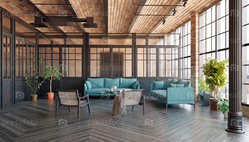 Современная гостиная в стиле лофт с диваном и журнальным столом. номер имеет минималистский и чистый дизайн с акцентом на функциональность и комфорт. 3D-рендеринг