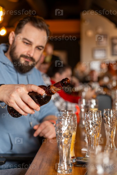 Молодой красивый мужчина с бородой наливает пиво из бутылки в стаканы для друзей. Концепция вечеринки в пабе