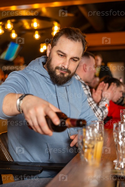 Молодой красивый мужчина с бородой наливает пиво из бутылки в стаканы для друзей. Концепция вечеринки в пабе