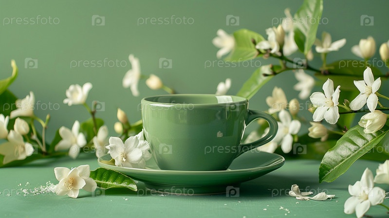 Зеленая чашка с зеленым блюдцем на зеленом фоне с цветами жасмина