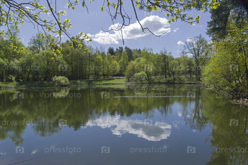 Нижний пруд в каскаде прудов в усадьбе Узкое. Битцевский лесопарк, Москва. Солнечный день в начале мая