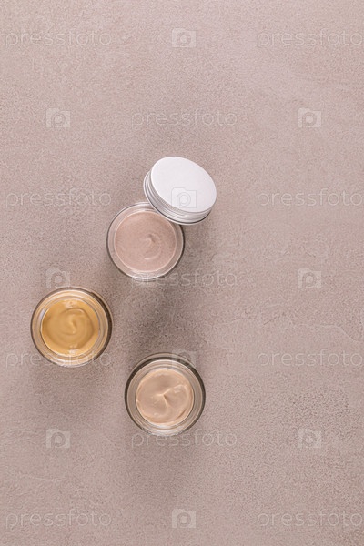 Три красивые стеклянные косметические баночки с нежной текстурой крема для ухода за лицом и телом на каменно-бежевом фоне. Вертикальный вид сверху. Место для копирования