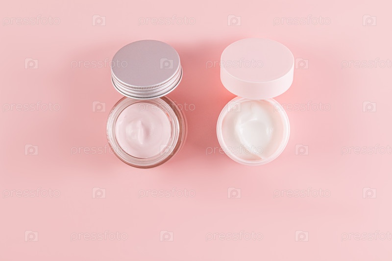 Две косметические баночки с нежным кремом для ухода за молодой кожей на розовом фоне. Открытая банка. Копия помещения. Натуральная косметика. Вид сверху