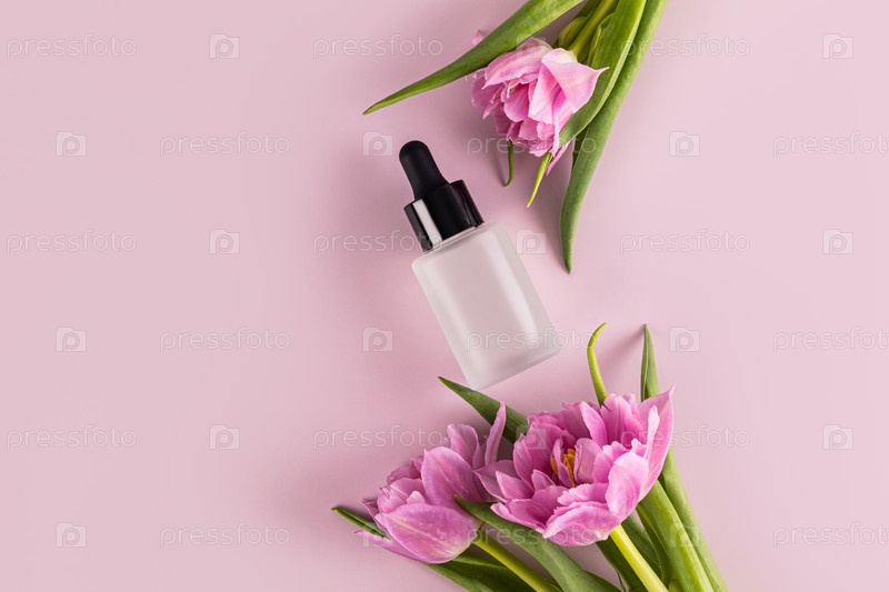 Матовый косметический флакон-капельница с натуральным органическим продуктом, сывороткой для лица и шеи. сиреневый фон. Цветы. Копировальное пространство