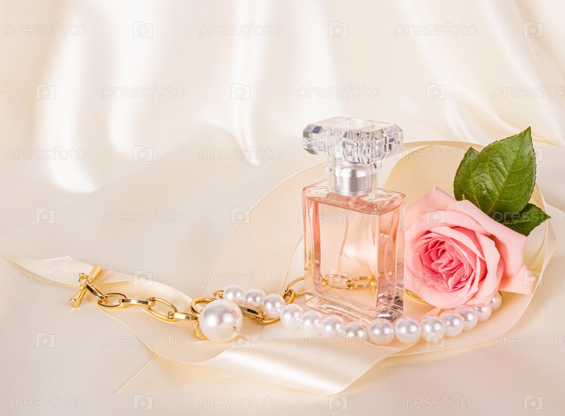 Красивая композиция с элегантным флаконом духов, розовыми розами, золотым колье и атласной лентой. Нежный сатиновый бежевый фон