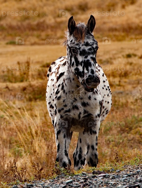 Россия, Горный Алтай. Белая лошадь с черными пятнами по всему телу на осеннем пастбище вдоль Чуйского тракта