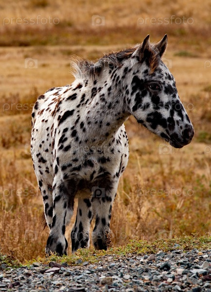 Россия, Горный Алтай. Белая лошадь с черными пятнами по всему телу на осеннем пастбище вдоль Чуйского тракта