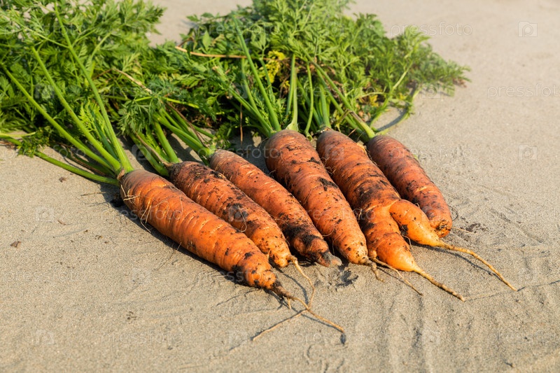Свежую морковь достают из земли и кладут на песок