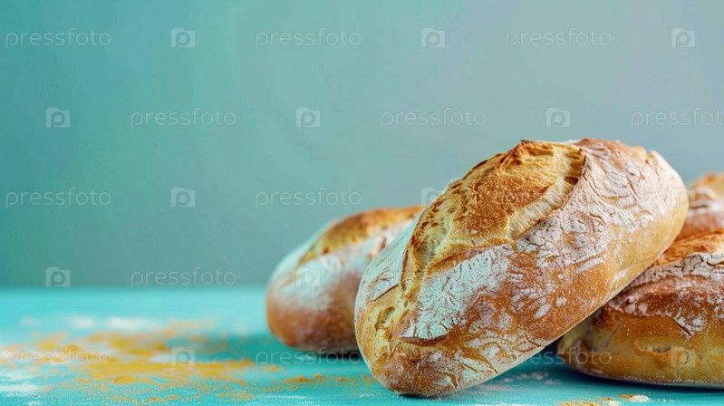 Крупный план трех свежеиспеченных булочек на синем столе, стиль минимализма с копировальным пространством