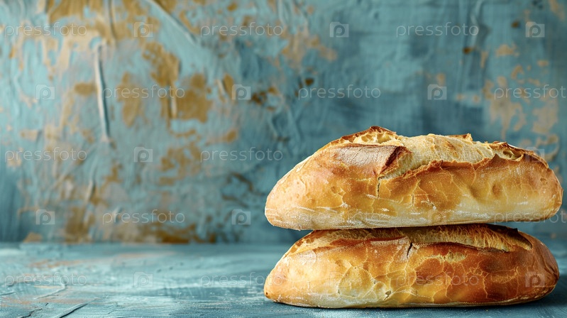 Два свежеиспеченных вкусных хлеба лежат на синем старомодном фоне, в минималистском стиле