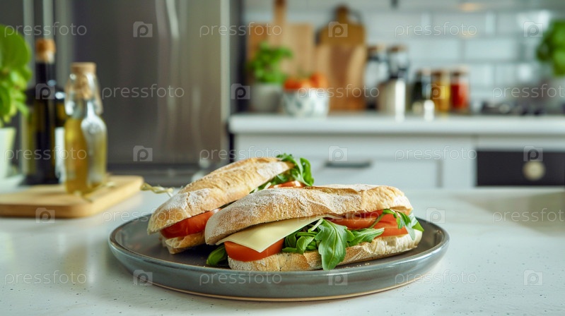 Вкусные и свежие бутерброды на серой тарелке на современной светлой кухне, студийная съемка