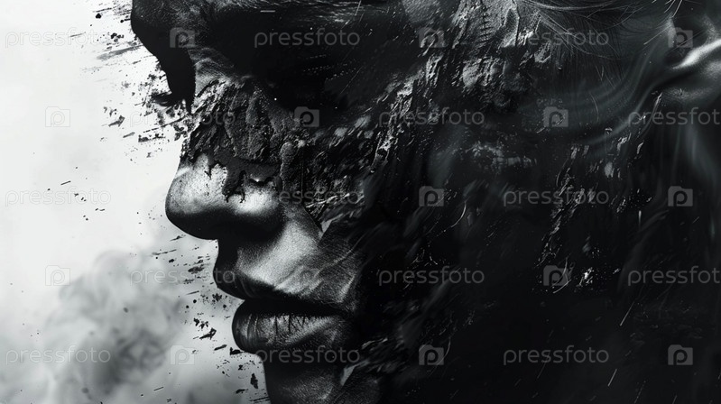 Крупный план монохромного лица молодой девушки, покрытого патиной горечи, обиды и предательства