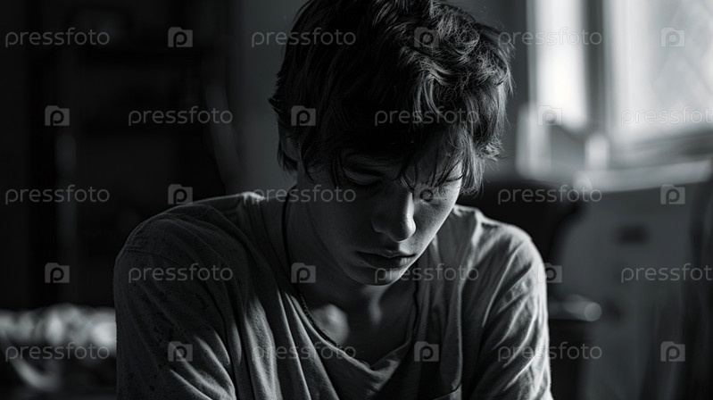 Грустный подросток сидит в комнате в монохромном стиле