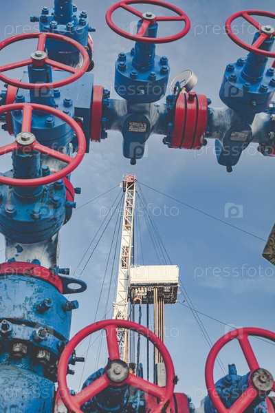 Арматура фонтана высокого давления в газовой скважине. На заднем плане размытое изображение буровой установки на северном газовом месторождении в Арктике