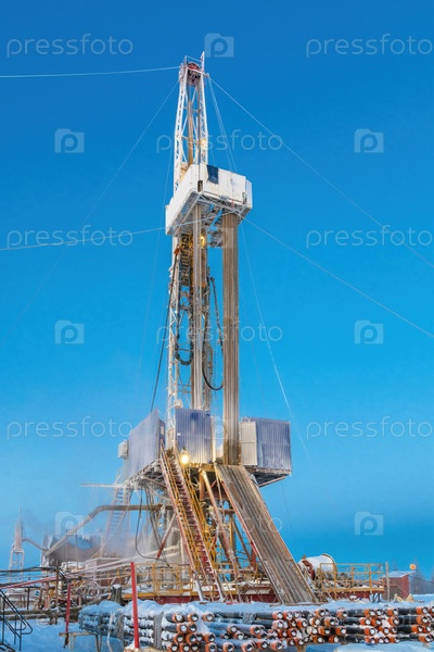 Бурение скважин зимой на нефтегазовом месторождении в Арктике. Полярный день с текстурированным красивым небом. Паровые затяжки для отопительного оборудования