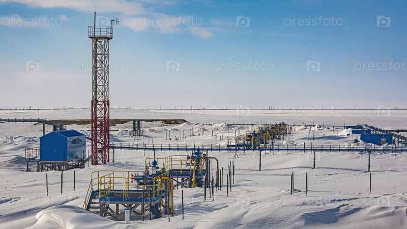 Скважины, добывающие природный газ на месторождении в Арктике. Фонтанное оборудование и технологическая обвязка группы скважин для добычи газа. Зима. День. Инфраструктура газодобывающего предприятия