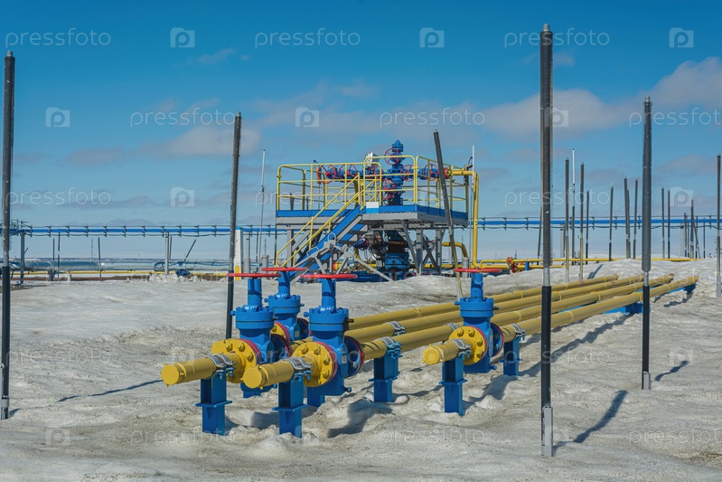 Фонтанное оборудование и технологическая обвязка группы скважин для добычи газа. Зима. День. Замораживание добычи и поставок природного газа. Прекращение транспортировки газа потребителям