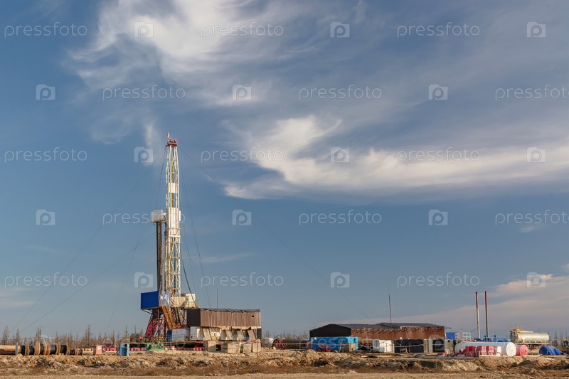 Участок в северной тундре на нефтегазовом месторождении. Буровая установка для бурения скважин. Инфраструктура и буровое оборудование для проведения буровых работ. Красивое выразительное небо