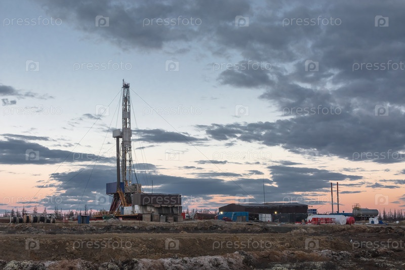 Участок в северной тундре на нефтегазовом месторождении. Буровая установка для бурения скважин. Инфраструктура и буровое оборудование для проведения буровых работ. Красивое выразительное небо