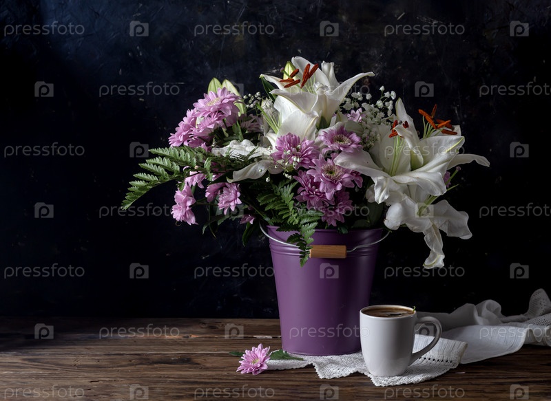 Натюрморт с букетом цветов и чашкой кофе