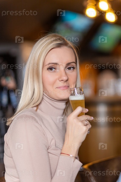 Молодая жизнерадостная блондинка смотрит на вас во время тоста, со стаканом пива перед камерой на фоне парней, сидящих у барной стойки в пабе