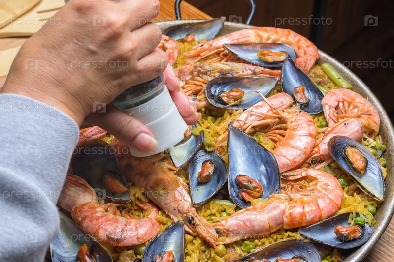 Крупный план ручной приправы традиционной паэльи из морепродуктов с насыщенными цветами, типичной испанской кухни, Майорка, Балеарские острова, Испания,