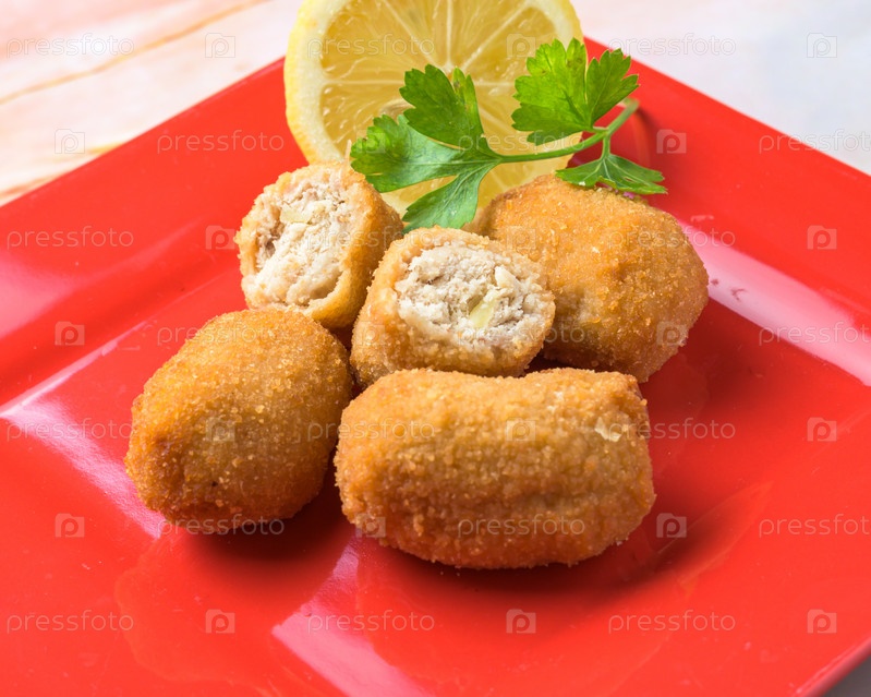 Жареные крокеты подаются с долькой лимона и петрушкой на красной тарелке, типичная еда, типичная средиземноморская кухня Майорки, типичная для Балеарских островов Майорка, Испания,