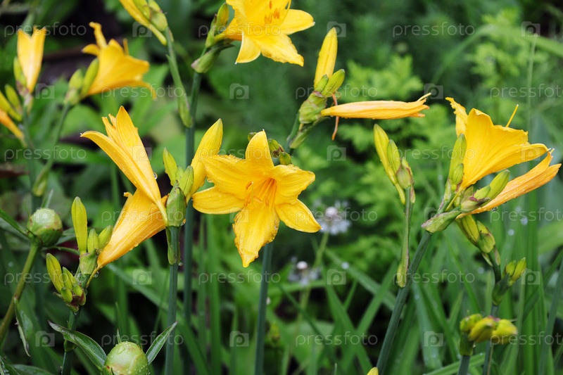 Ярко-желтый лилейник цветет в саду после дождя