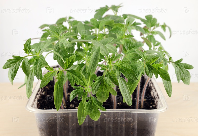 Рассада томатов в пластиковом контейнере, выращенная в домашних условиях