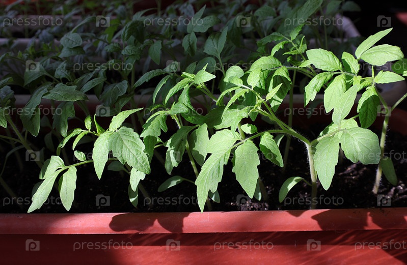 Рассада томатов в домашних условиях, частично освещенная резким солнечным светом