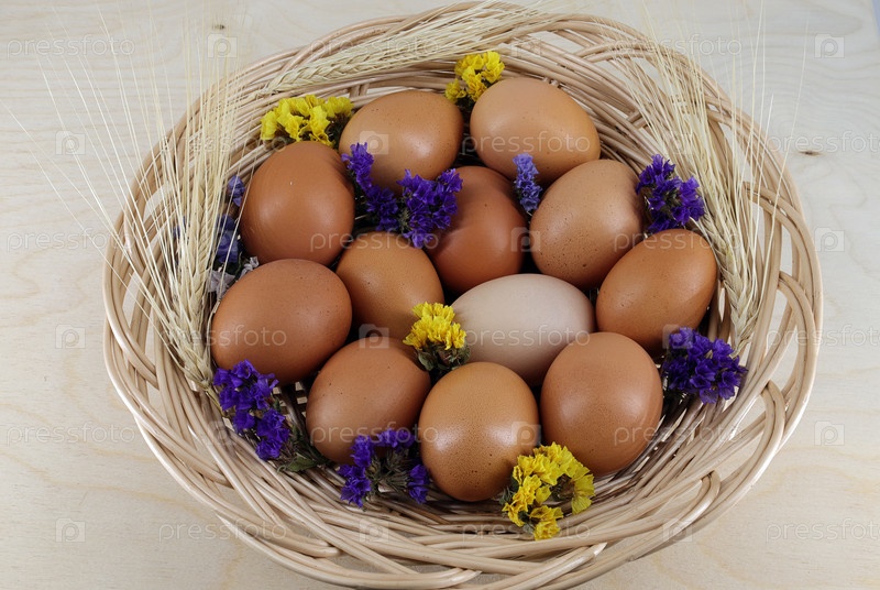 Свежие яйца и сухие цветы в обрамлении колосьев ржи лежат в плетеной корзине