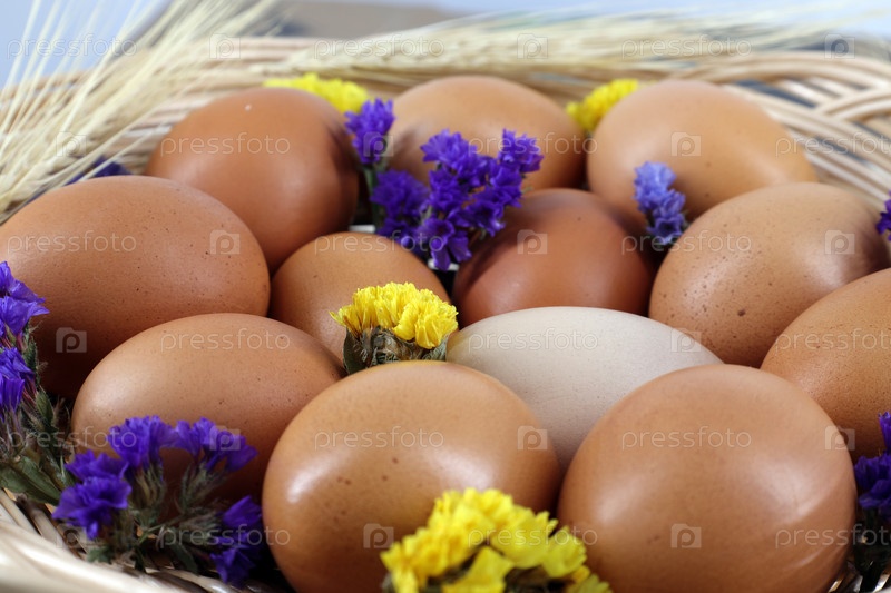 Куриные яйца, украшенные золотистыми и голубыми сухоцветами (статица, кермек) в плетеной корзине