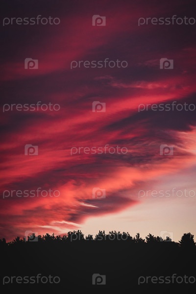 Красивые облака над лесом окрашены в красный на закате